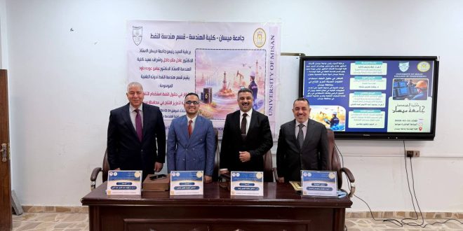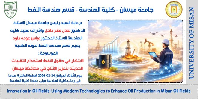 برعاية السيد رئيس جامعة ميسان الأستاذ الدكتور عادل مانع داخل، وبإشراف السيد عميد كلية الهندسة الأستاذ الدكتور عباس عودة داود، أقام قسم هندسة النفط في كلية الهندسة – جامعة ميسان، يوم الثلاثاء الموافق 24/2/2026، ندوة علمية تخصصية بعنوان:“الابتكار في حقول النفط: استخدام التقنيات الحديثة لتعزيز الإنتاج في محافظة ميسان”وذلك على …