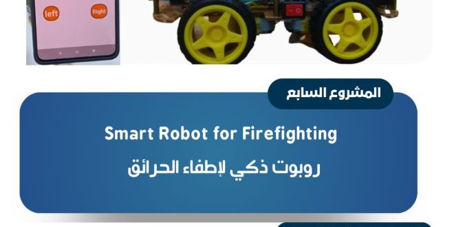 Smart Robot for Firefightingروبوت ذكي لإطفاء الحرائقيهدف هذا المشروع إلى تصميم وتنفيذ روبوت ذكي صغير الحجم على هيئة سيارة، قادر على اكتشاف مصادر الحريق وإخمادها تلقائيًا. يعتمد النظام على لوحة تحكم مركزية (Arduino) كوحدة معالجة رئيسية، تتصل بعدد من المكونات الإلكترونية والميكانيكية لتمكين الروبوت من أداء مهمته بكفاءة.يتألف الروبوت من …