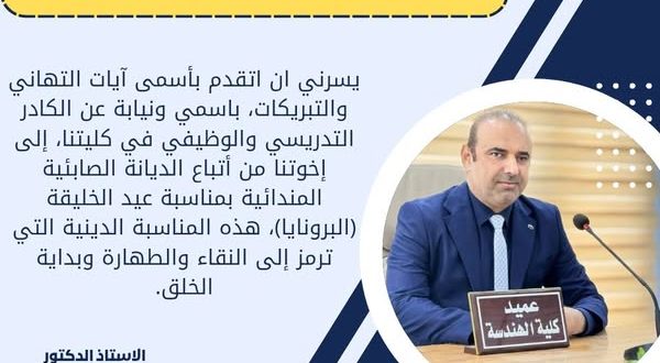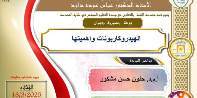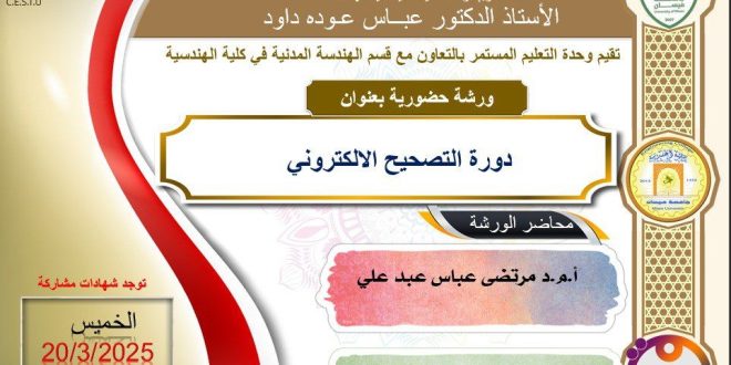 برعاية السيد رئيس جامعة ميسان الاستاذ الدكتور عادل مانع داخل، وباشراف السيد عميد كلية الهندسة الاستاذ الدكتور عباس عودة داود، تقيم وحدة التعليم المستمر في كلية الهندسة، بالتعاون مع قسم الهندسة المدنية ورشة حضورية بعنوان: (التصحيح الالكتروني). والتي سيحاضر فيها الاستاذ المساعد الدكتور مرتضى عباس عبد علي رئيس قسم الهندسة …