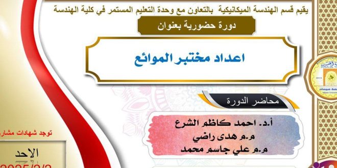 برعاية السيد رئيس جامعة ميسان الأستاذ الدكتور عادل مانع داخل وبأشراف عميد كلية الهندسة الأستاذ الدكتور عباس عودة داود، تقيم وحدة التعليم المستمر في كلية الهندسة بالتعاون مع قسم الهندسة الميكانيكية دورة حضورية بعنوان (اعداد مختبر الموائع) والتي سيحاضر فيها الاستاذ الدكتور احمد كاظم الشرع والمدرس المساعد هدى راضي والمدرس …