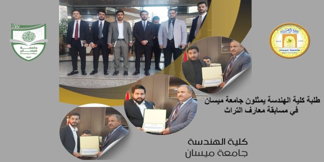 شارك مجموعة من طلبة كلية الهندسة ممثلين عن جامعة ميسان في مسابقة “معارف التراث” التي نظمتها العتبة العباسية المقدسة في جامعة كربلاء، حيث حققوا المركز الرابع بين الجامعات الحكومية والأهلية المشاركة.وضم فريق جامعة ميسان المدرس الدكتور حيدر جبر فليح منسق جامعتنا بالاضافة الى الطلبة التالية أسماؤهم من قسم الهندسة الكهربائية: …