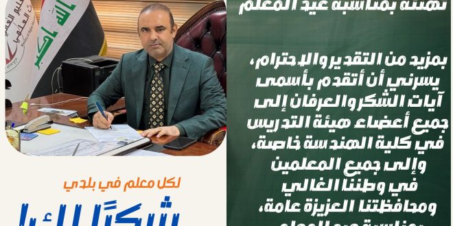بمزيد من التقدير والاحترام، يسرني أن أتقدم بأسمى آيات الشكر والعرفان إلى جميع أعضاء هيئة التدريس في كلية الهندسة خاصة، وإلى جميع المعلمين في وطننا الغالي ومحافظتنا العزيزة عامة، بمناسبة عيد المعلم.إن هذه المناسبة العزيزة تذكرنا بالدور العظيم الذي يقوم به المعلمون في بناء الأجيال وصناعة المستقبل، فهم نبراس العلم …