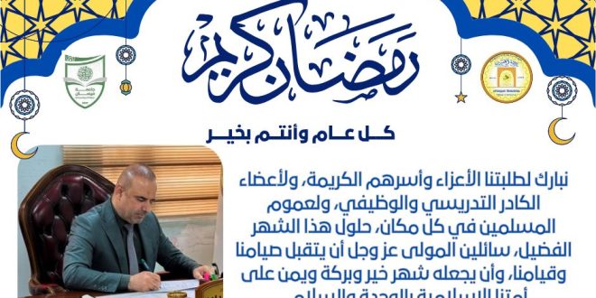 بسم الله الرحمن الرحيم يسرني أن أتقدم وبالنيابة عن الكادر التدريسي والوظيفي في كلية الهندسة جامعة ميسان، بأطيب التهاني وأصدق التمنيات بمناسبة حلول شهر رمضان المبارك، أعاده الله علينا وعليكم بالخير والبركات، شهر الرحمة والمغفرة والعتق من النار.نبارك لطلبتنا الأعزاء وأسرهم الكريمة، ولأعضاء الكادر التدريسي والوظيفي، ولعموم المسلمين في كل …