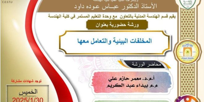 برعاية رئيس جامعة ميسان الأستاذ الدكتور عادل مانع داخل و بأشراف عميد كلية الهندسة الأستاذ الدكتور عباس عودة داود , تقيم وحدة التعليم المستمر في كلية الهندسة بالتعاون مع قسم الهندسة المدنية ورشة حضورية بعنوان (المخلفات البيئية والتعامل معها) والتي سيحاضر فيها فيها الاستاذ المساعد الدكتور معمر حازم علي و …