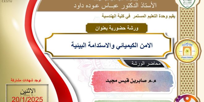 برعاية السيد رئيس جامعة ميسان الأستاذ الدكتور عادل مانع داخل و بأشراف عميد كلية الهندسة الأستاذ الدكتور عباس عودة داود , تقيم وحدة التعليم المستمر في كلية الهندسة ورشة حضورية بعنوان (الامن الكيميائي والاستدامة البيئية) والتي ستحاضر فيها المدرس المساعد صابرين قيس مجيد التدريسية في كلية الهندسة والتي سوف تقام …