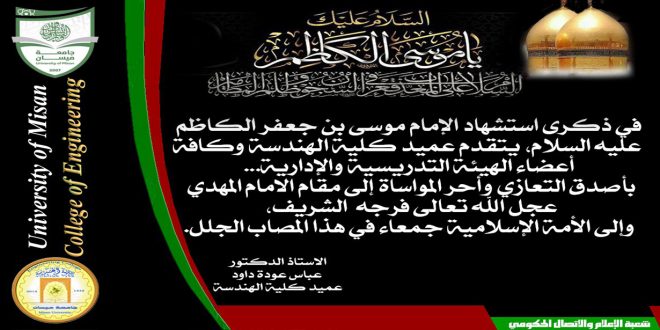 بسم الله الرحمن الرحيم(إِنَّمَا يُرِيدُ اللَّهُ لِيُذْهِبَ عَنكُمُ الرِّجْسَ أَهْلَ الْبَيْتِ وَيُطَهِّرَكُمْ تَطْهِيرًا)صدق الله العلي العظيم بقلوب خاشعة ومفعمة بالحزن والإجلال، تستذكر كلية الهندسة جامعة ميسان ممثلة بالسيد العميد وكافة أعضاء الهيئة التدريسية والكوادر الادارية و الطلبة ذكرى استشهاد سابع الأئمة الأطهار، الإمام موسى بن جعفر الكاظم عليه السلام، الذي …
