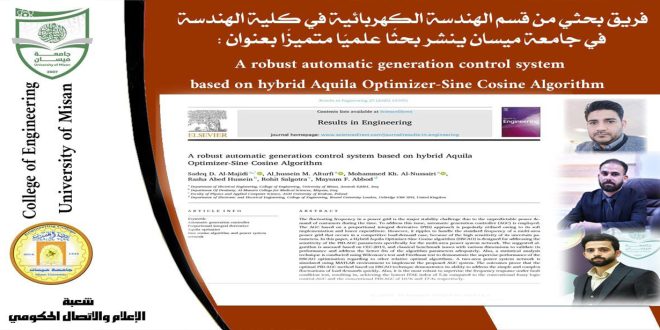 تمكّن فريق بحثي من قسم الهندسة الكهربائية في كلية الهندسة بجامعة ميسان من نشر بحث علمي بعنوان:(A robust automatic generation control system based on hybrid Aquila Optimizer-Sine Cosine Algorithm)في المجلة العالمية Results in Engineering، وهي مجلة مصنفة ضمن قواعد بيانات Scopus و Clarivate، وتندرج ضمن الربع الأول (Q1) من التصنيفات …