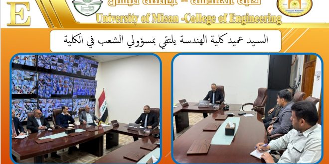استقبل السيد عميد كلية الهندسة الأستاذ الدكتور عباس عوده داود، رئيس لجنة تحديث المخطط الأساسي لموقع 110 دونم، في مكتبه صباح يوم الأحد الموافق 12/1/2025، السيد مساعد رئيس جامعة ميسان للشؤون الإدارية والمالية والقانونية، الأستاذ المساعد الدكتور محمد جبار تويه. جرى خلال اللقاء مناقشة تخصيص المساحات اللازمة لمواقف السيارات والأبنية …