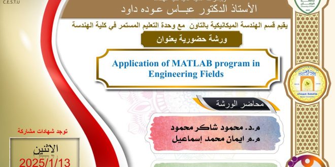 برعاية السيد رئيس جامعة ميسان الأستاذ الدكتور عادل مانع داخل وبأشراف عميد كلية الهندسة الأستاذ الدكتور عباس عودة داود، يقيم قسم الهندسة الميكانيكية بالتعاون مع وحدة التعليم المستمر في كلية الهندسة ورشة حضورية بعنوان (Application of MATLAB program in Engineering Fields) والتي سيحاضر بها المدرس الدكتور (محمود شاكر محمود) رئيس …