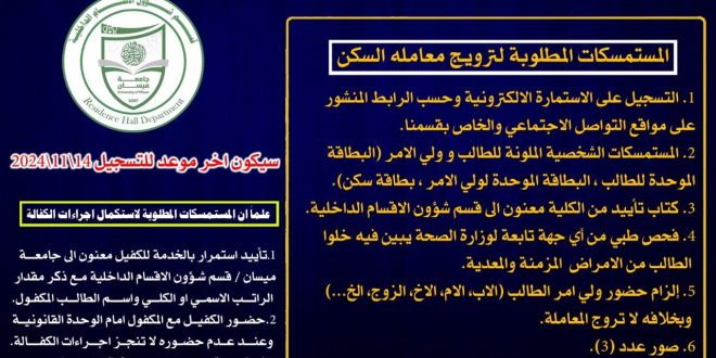 اعلان هاااام... الى طلبتنا المقبولين في كليتنا للعام الدراسي 2024-2025 الراغبين بالسكن في الأقسام الداخلية