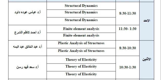 تُعلن كلية الهندسة – قسم الهندسة المدنية عن جدول محاضرات الدراسات العليا (الماجستير) للعام الدراسي 2025–2026 / الفصل الدراسي الثاني، والمبيّن في الجدول ادناه.راجين من طلبتنا الأعزاء الاطلاع بدقة على مواعيد المحاضرات والالتزام بالحضور وفق التوقيتات المحددة، متمنين لهم فصلًا دراسيًا موفقًا ومليئًا بالإنجاز والتميّز العلمي.===========================================شعبة الاعلام والاتصال الحكوميكلية الهندسة …