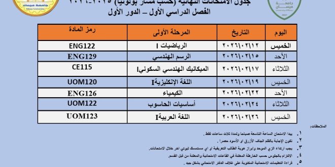يُعلن قسم الهندسة المدنية عن جدول الامتحانات النهائية للفصل الدراسي الأول للمرحلة الأولى، الدراسة الصباحية، للعام الدراسي 2025–2026.وعليه، يدعو القسم طلبته الأعزاء إلى الاطلاع على الجدول بدقة، والالتزام بـ التعليمات الامتحانية والمواعيد المحددة، مع تمنياتنا لهم بدوام التوفيق والنجاح وتحقيق أفضل النتائج في مسيرتهم العلمية.==========================شعبة الإعلام والاتصال الحكوميكلية الهندسة – …