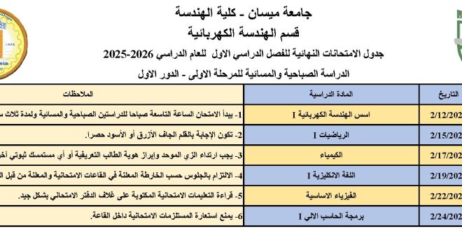 يُعلن قسم الهندسة الكهربائية عن جدول الامتحانات النهائية للفصل الدراسي الأول للمرحلة الأولى، للدراستين الصباحية والمسائية، للعام الدراسي 2025–2026.وعليه، يدعو القسم طلبته الأعزاء إلى الاطلاع على الجدول بدقة، والالتزام بـ التعليمات الامتحانية والمواعيد المحددة، مع تمنياتنا لهم بدوام التوفيق والنجاح وتحقيق أفضل النتائج في مسيرتهم العلمية.==========================شعبة الإعلام والاتصال الحكوميكلية الهندسة …