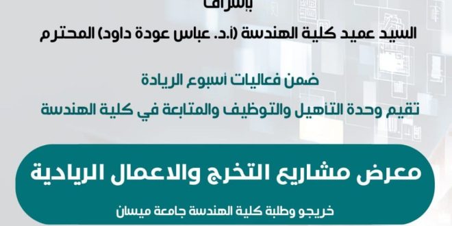 برعايةالسيد رئيس جامعة ميسان (أ.د. عادل مانع داخل) المحترمبإشرافالسيد عميد كلية الهندسة (أ.د. عباس عودة داود) المحترموضمن فعاليات أسبوع الريادة العالمي ستقيم وحدة التأهيل والتوظيف والمتابعة في كلية الهندسةمعرض مشاريع التخرج والأعمال الرياديةسيشارك معنا في معرض مشاريع التخرج والأعمال الريادية:نادي البرمجةورشة ابتكارفرق كوكل المكان: مبنى قسم الهندسة الكهربائية الأربعاء ، …