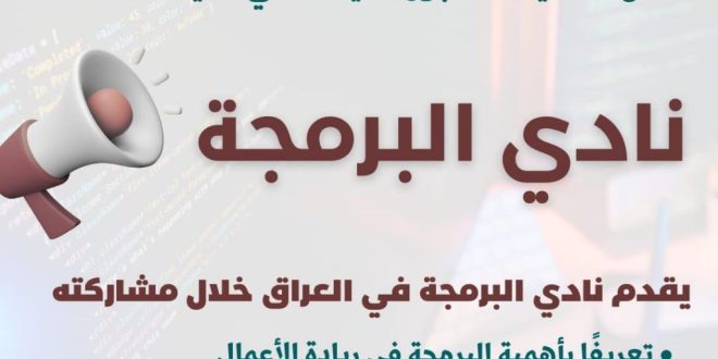 #إعلان برعايةالسيد رئيس جامعة ميسان (أ.د. عادل مانع داخل) المحترمبإشرافالسيد عميد كلية الهندسة (أ.د. عباس عودة داود) المحترمضمن فعاليات أسبوع الريادة في كلية الهندسةنادي البرمجةيقدّم نادي البرمجة في العراق خلال مشاركته:* تعريفًا بأهمية البرمجة في ريادة الأعمال* أمثلة لمشاريع تقنية ريادية* فرصًا للتعلم والانضمام إلى أنشطة النادي المكان: مبنى قسم …