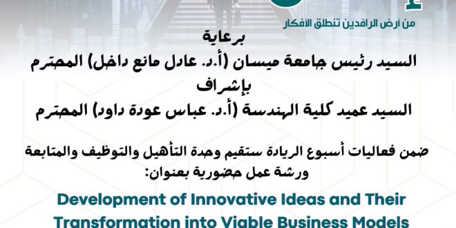 برعايةالسيد رئيس جامعة ميسان (أ.د. عادل مانع داخل) المحترمبإشرافالسيد عميد كلية الهندسة (أ.د. عباس عودة داود) المحترمضمن فعاليات أسبوع الريادة ستقيم وحدة التأهيل والتوظيف والمتابعةورشة عمل حضورية بعنوان:Development of Innovative Ideas and Their Transformation into Viable Business Modelsمحاضر الورشة:المهندس علي محمد غازيمدير ومؤسس ورشة ابتكار للتطوير والتدريب التكنولوجي يوم الخميس …