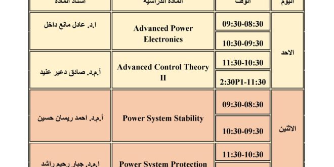 تُعلن كلية الهندسة – قسم الهندسة الكهربائية عن جدول محاضرات الدراسات العليا (الماجستير) للعام الدراسي 2025–2026 / الفصل الدراسي الثاني، والمبيّن في الجدول ادناه.راجين من طلبتنا الأعزاء الاطلاع بدقة على مواعيد المحاضرات والالتزام بالحضور وفق التوقيتات المحددة، متمنين لهم فصلًا دراسيًا موفقًا ومليئًا بالإنجاز والتميّز العلمي.===========================================شعبة الاعلام والاتصال الحكوميكلية الهندسة …
