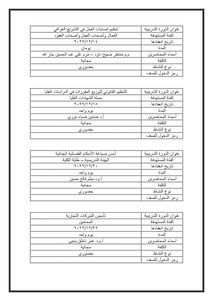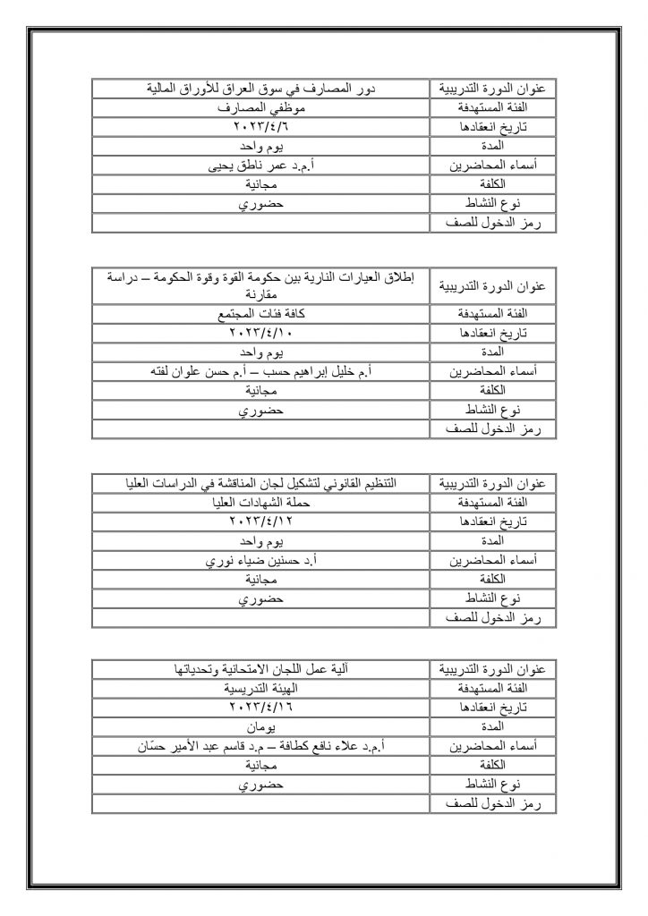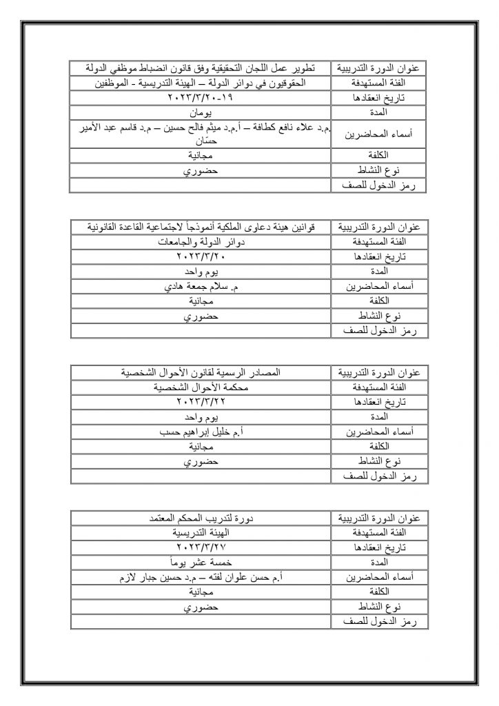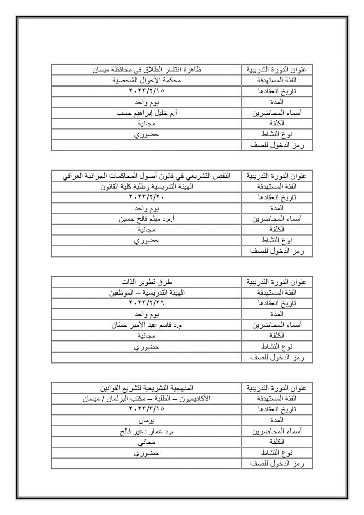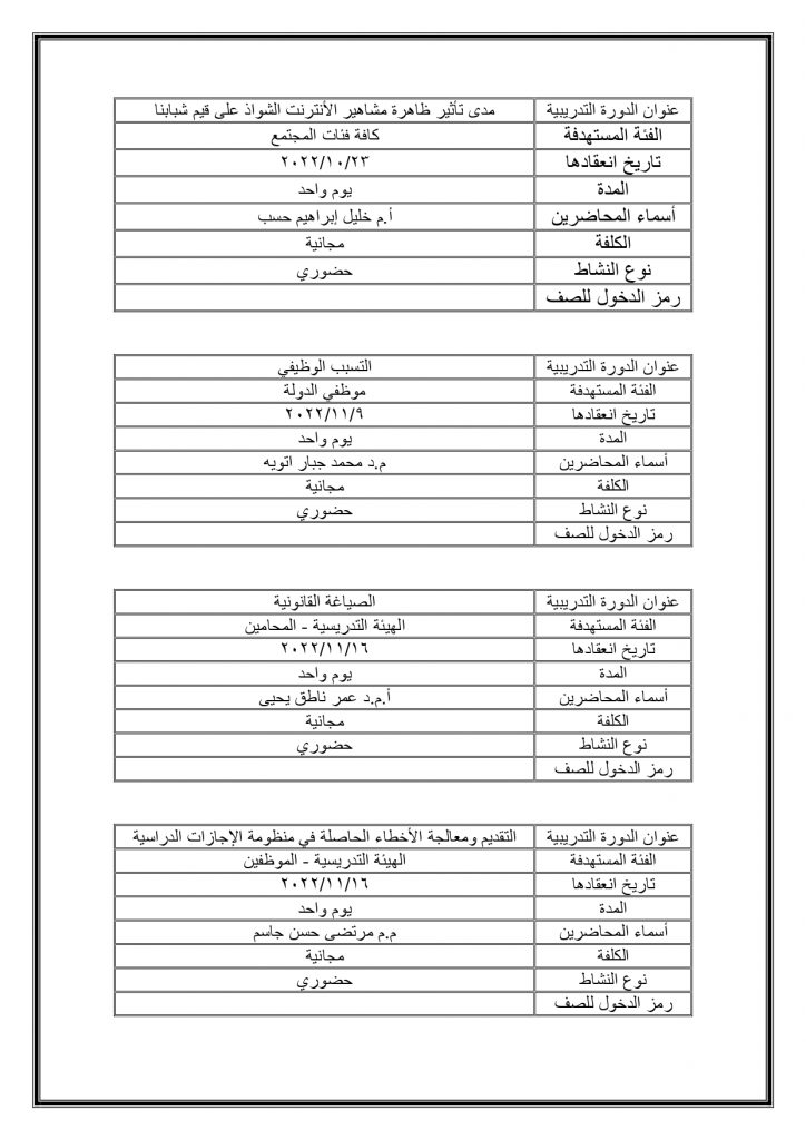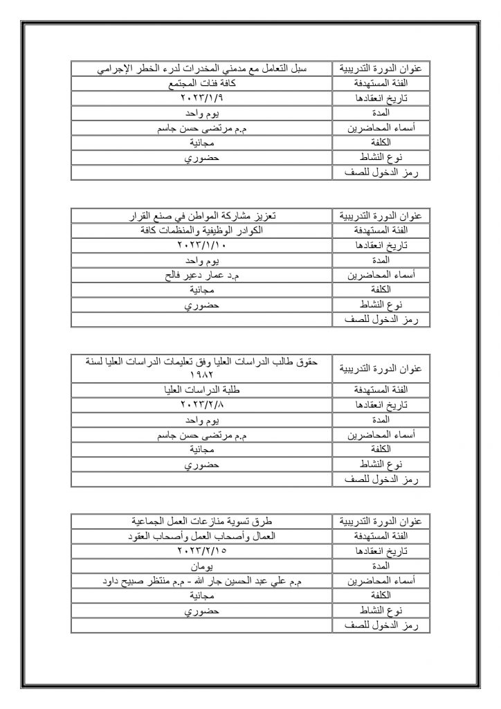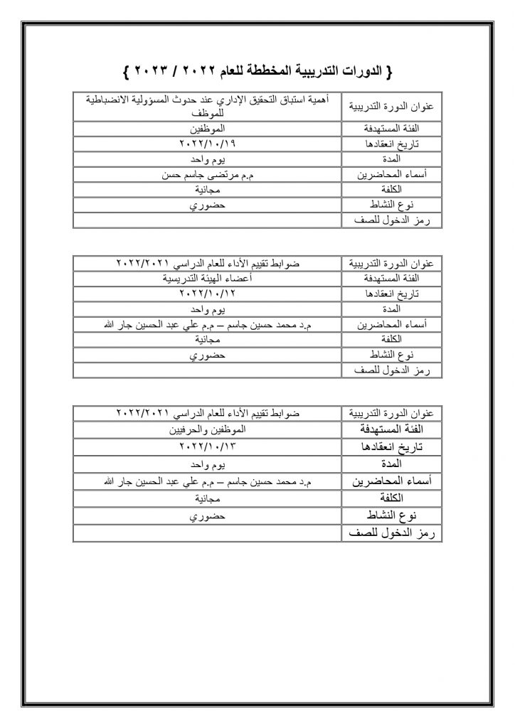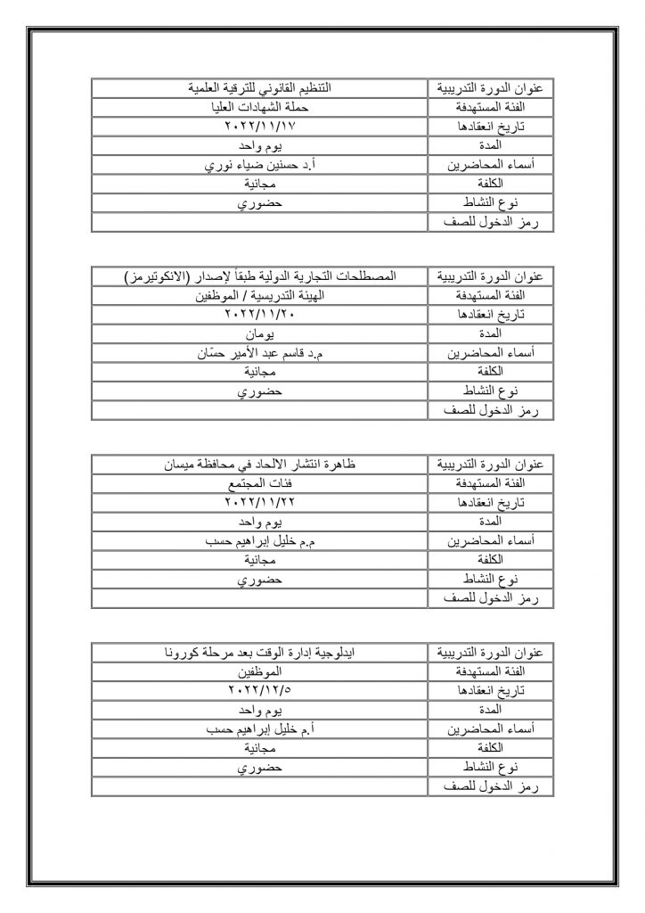 جدول الدورات التدريبية للعام الدراسي 2024-2025