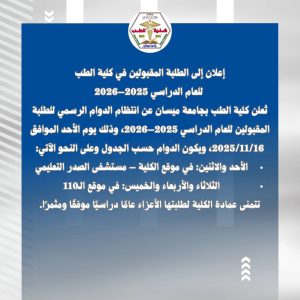 تعلن كلية الطب بجامعة ميسان عن انتظام الدوام الرسمي للطلبة المقبولين للعام الدراسي 2025 -2026 ويكون الدوام حسب الجدول وعلى النحو الاتي :