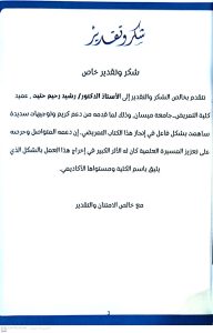 كرم السيد عميد كلية التمريض جامعة ميسان الأستاذ الدكتور رشيد رحيم حتيت الممرضان الجامعيان مريم هاشم فعل معيدة في الكلية و سجاد رهيف صالح دائرة صحة ميسان بشهادات تقديرية وذلك تقديرا لجهودهم المبذولة في العمل على إصدار مؤلف علمي بعنوان ( دليل التمريض العملي )
