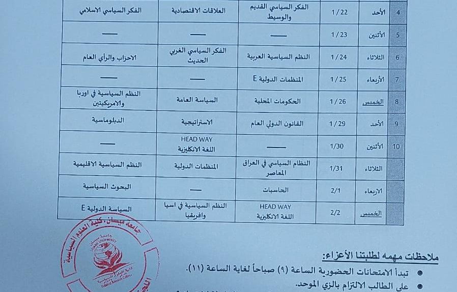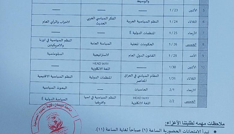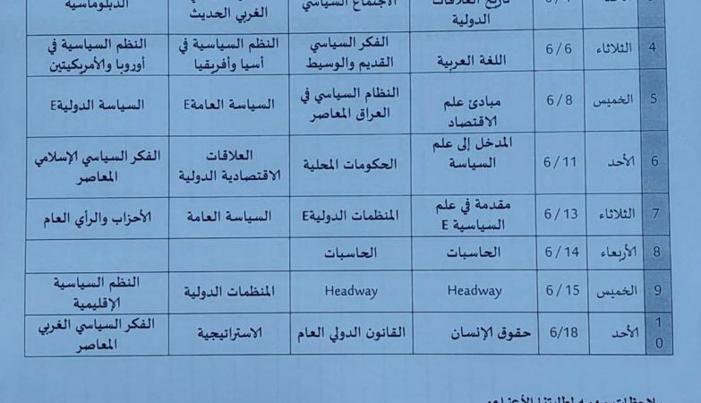 المرحلة الاولى الوقتالاحدالاثنينالثلاثاءالاربعاءالخميس8:30تاريخ العلاقات الدولية(م.م/محمد علي محمد)الانظمة السياسية والدستورية(م.م/علي هاشم عبد الحسن)الانظمة السياسية والدستورية(م.م/علي هاشم عبد الحسن)المدخل لدراسة القانون (أ.م.د/صدام عبد الحسين رميش)مبادئ علم الاقتصاد(م.م/محسن هاشم كرم)9:30تاريخ العلاقات الدولية(م.م/محمد علي محمد)الانظمة السياسية والدستورية(م.م/علي هاشم عبد الحسن)اللغة الانكليزية Headway (م.م/ايناس محمد)المدخل لدراسة القانون (أ.م.د/صدام عبد الحسين رميش)مبادئ علم الاقتصاد(م.م/محسن هاشم كرم)10:30اللغة العربية (م.د/عادل كمون)المدخل الى علم السياسة (م.م/علي محمد راضي)مقدمة في …