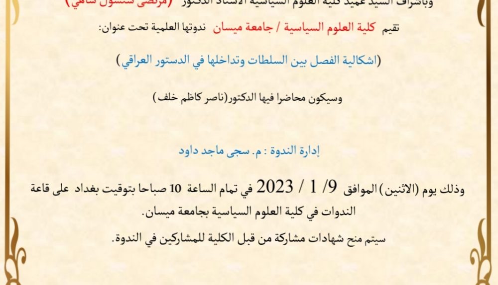برعاية رئيس جامعة ميسان الأستاذ الدكتور عادل مانع داخل ، وبإشراف عميد كلية العلوم السياسية الأستاذ المساعد الدكتور محمد يونس الياسري، نظمت كلية العلوم السياسية كرنفالًا علميًا متميزًا، تزامنًا مع الذكرى السنوية الثامنة عشرة لتأسيس الجامعة، في احتفالية جسّدت عمق العلاقة بين العلم والثقافة، واحتفت بنتاجات الطلبة الفكرية وإبداعاتهم الأدبية. الكرنفال تضمن إعلان أسماء الفائزين في مسابقة “أفضل مقال”، وهي …