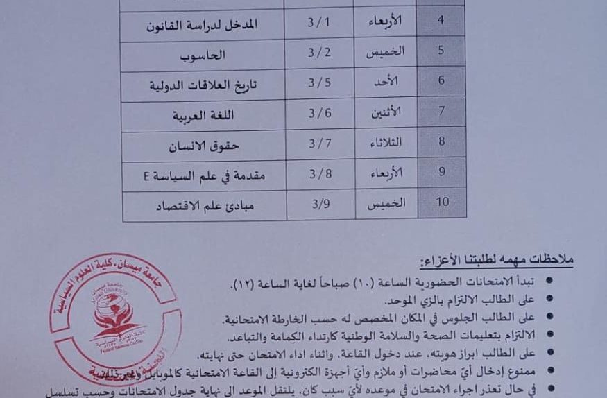 أكمل القراءة »جدول المحاضرات الاسبوعية لكلية العلوم السياسية في جامعة ميسان للعام الدراسي 2024 – 2025