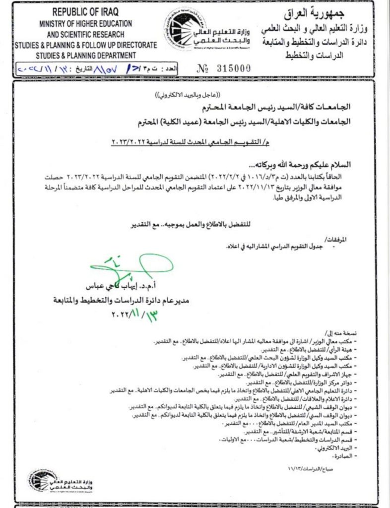 | موعد بدء وانتهاء الفصل الدراسي الأول | الاحد | 21/9/2025 لغاية 31/12/2025 | (15) أسبوع | لا يوجد |