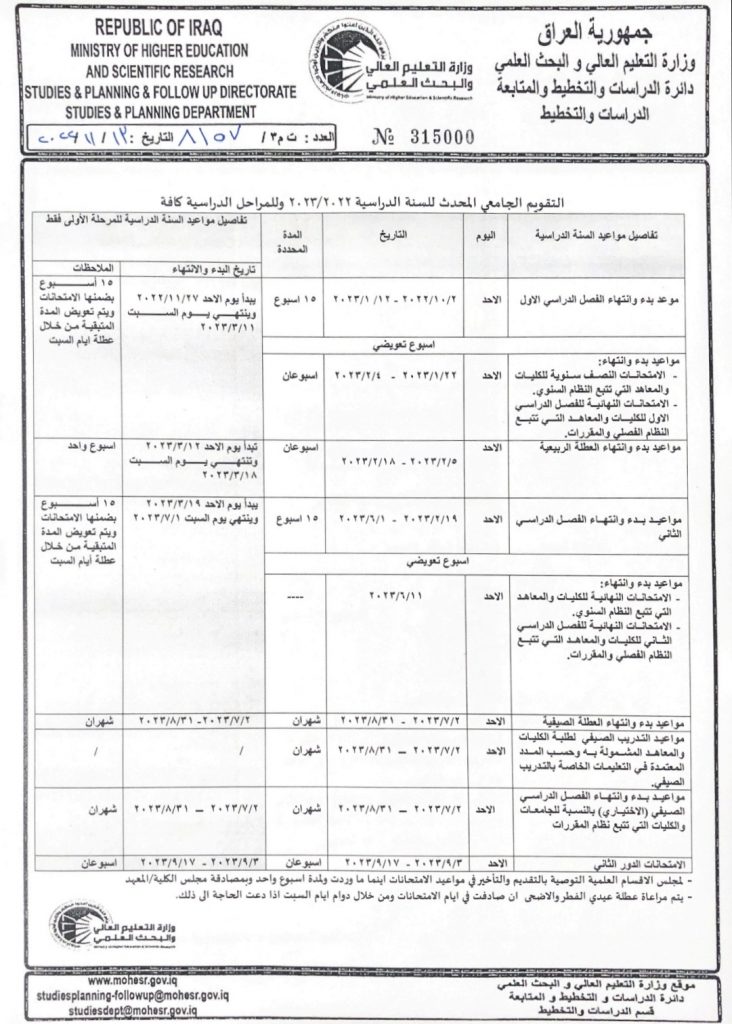 | موعد بدء امتحانات الدور الثاني | الثلاثاء | 1/9/2026 | / | تترك مرونة بدئها للجامعات في حال تداخلت مع امتحانات طلبة الإعدادية |