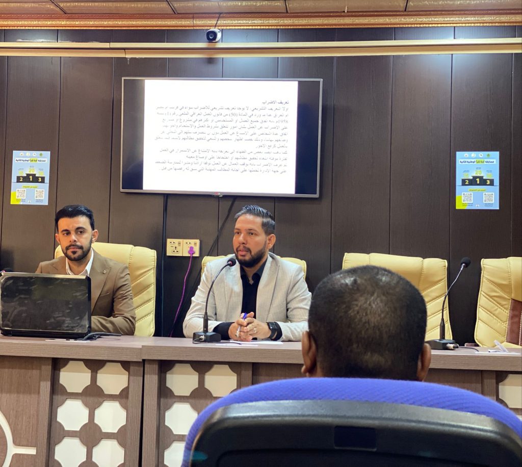 هدفت الندوة إلى تسليط الضوء على الجوانب القانونية المرتبطة بالإضراب الوظيفي في العراق، وتحليل موقف التشريعات الوطنية من هذا الحق، وبيان مدى انسجامها مع المواثيق الدولية، إضافة إلى مناقشة الإشكالات العملية التي تعيق ممارسة الموظفين لحقهم في التعبير عن المطالب المهنية من خلال الإضراب.