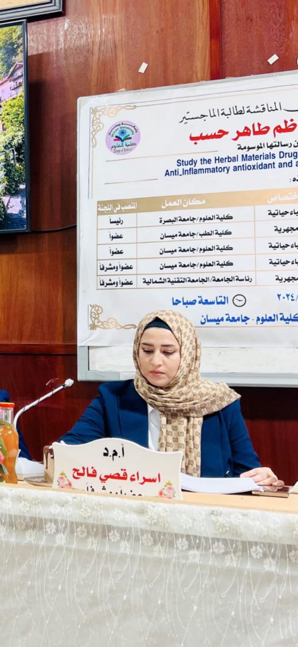 تدريسية في كلية العلوم جامعة ميسان تقيم اطروحة دكتوراه ضمن منظومة الخبرة التابعة لوزارة التعليم العالي والبحث العلمي تم التقييم العلمي لاطروحة دكتوراه والموسومة Study hydrogen sulfide and cystathionine γ – lyase levels and its relationship with some biochemical parameters for patients with neurological diseases من قبل ا.م.د اسراء قصي فالح التدريسية في كلية العلوم جامعة ميسان -قسم الكيمياء لمصلحة كلية العلوم / جامعة الموصل