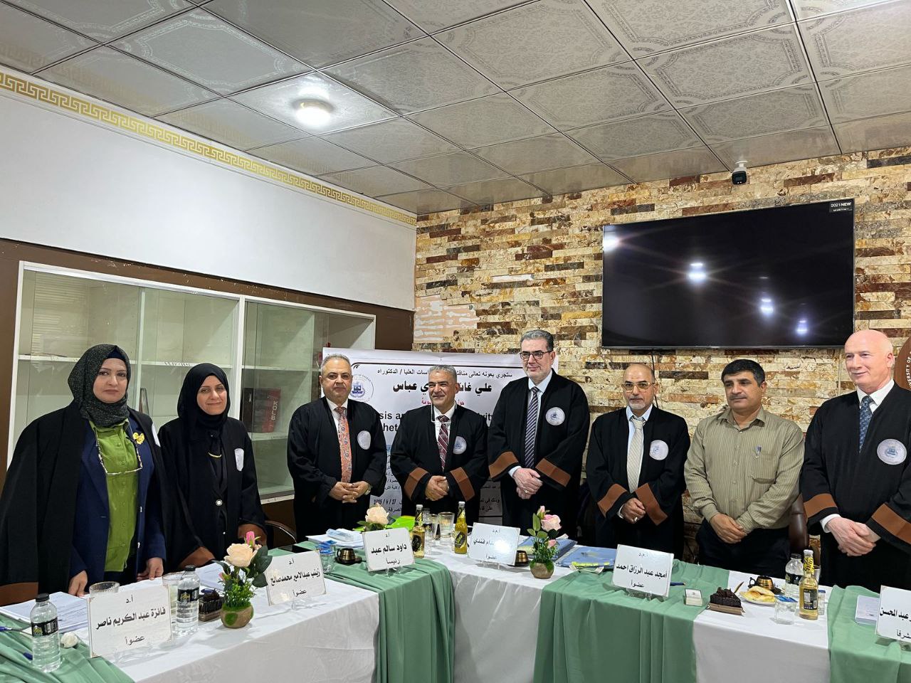 عميد كليه العلوم جامعه ميسان عضو لجنه مناقشه اطروحه الدكتوراه في جامعه البصره كليه التربيه للعلوم الصرف شارك عميد كليه العلوم جامعه ميسان في عضويه لجنه مناقشه اطروحه الدكتوراه للطالب علي غانم سوادي في جامعه البصره كليه التربيه للعلوم الصرف والتي بعنوان تحضير ودراسه الفعالية البيولوجية لبعض المركبات الحلقية غير المتجانسة (DHP) تضمت تحضير بعض مركبات(DHP) ودراسه فعاليتها ضد مرض سرطان الرئه واثبتت بعض هذه المركبات المحضره فعالية ملحوظه ضد هذا المرض كما تضمنت الاطروحه دراسه الارساء الجزيئي لهذه المركبات لبيان التركيب المناسب لهذه المركبات و بين الارساء الجزيئي عددا من روابط والاواصر ما بين هذه المركبات والگاند و تكمن اهميه هذه الروابط وعددها وخصوصا الروابط الهيدروجينية التي تبين مدى فعاليه هذه المركبات وجد ان بعض هذه المركبات تمتلك روابط هيدروجينية اقل من خمسه روابط مما يثبت فعالية هذه المركبات ضد مرض السرطان الرائة وتالفت لجنه المناقشه من استاذ داود سالم عبد دكتوراه الكيمياء الكيمياء العضوية جامعة البصرة / كلية التربية للعلوم الصرفة رئيساً استاذ فائزة عبد الكريم ناصر دكتوراه الكيمياء الكيمياء العضوية أستاذ زينب عبد الامير محمد صالح دكتوراه الكيمياء كيمياء المضادات الحيوية جامعة البصرة / كلية التربية للعلوم الصرفة عضواً جامعة البصرة / كلية التربية للعلوم الصرفة عضواً أستاذ مساعد تحسين صدام فندي دكتوراه الكيمياء الكيمياء العضوية جامعة ميسان كلية العلوم عضواً ه أستاذ مساعد أمجد عبد الرزاق احمد دكتوراه الكيمياء / كيمياء عضوبة طبية أستاذ جامعة البصرة / كلية العلوم عضواً تحسين عبد القادر عبد المحسن دكتوراه الكيمياء الكيمياء العضوية جامعة البصرة / كلية التربية للعلوم الصرفة عضواً ومشرف
