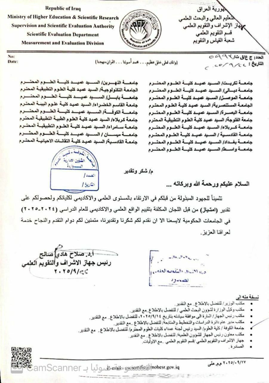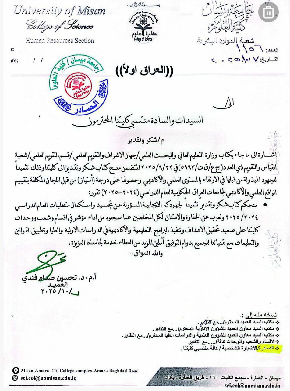 حصل عميد كلية العلوم – جامعة ميسان على كتاب شكر وتقدير من وزارة التعليم العالي والبحث العلمي / جهاز الإشراف والتقويم العلمي، وذلك تثميناً للجهود في الارتقاء بالمستوى العلمي والأكاديمي، وما تحقق في الكلية من إنجازات متميزة ضمن تقييم الواقع العلمي والأكاديمي للعام الدراسي 2024 – 2025. وبهذه المناسبة، قدّم عميد الكلية الأستاذ المساعد الدكتور تحسين صدام فندي كتاب شكر وتقدير إلى منتسبي الكلية كافة، تعبيراً عن اعتزازه بما بذلوه من جهود ومسؤولية عالية في إنجاز متطلبات التقييم، مؤكداً أن هذا النجاح ما كان ليتحقق لولا تكاتف الهيئات التدريسية والفنية والإدارية. وأوضح السيد العميد أن هذا التكريم الوزاري هو ثمرة العمل الجماعي، ودافع لمواصلة المسيرة العلمية والبحثية للكلية بما يعزز مكانتها بين الجامعات العراقي .