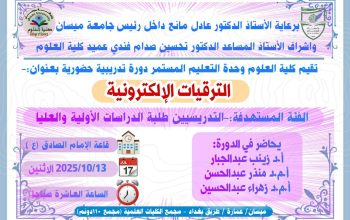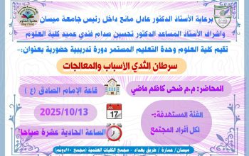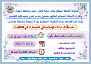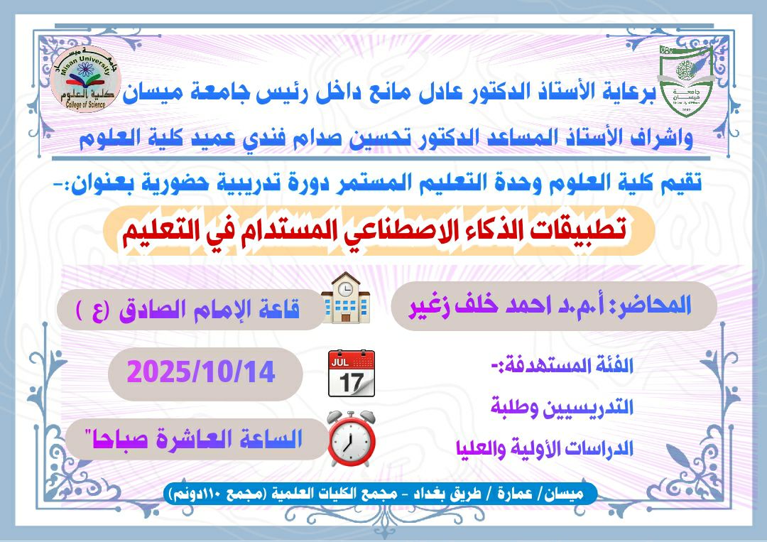 الإعلانات #أعلان_دورة_تدريبية في جامعة ميسان /كلية العلوم حول تطبيقات الذكاء الاصطناعي المستدام في التعليم. 2025-10-15