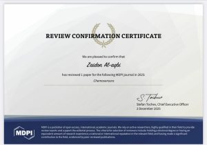 اختير الاستاذ المساعد الدكتور زيدون طارق هاشم مقرر قسم الكيمياء في كلية العلوم لتقييم بحث علمي ضمن وقائع المجلتين العلميتين Chemosensors والتي تندرج ضمن مستوعبات سكوبس وكلاريفيت وذات معامل تأثير كلاريفيت 3.7 و سايت سكور سكوبس 7.3 وتقع ضمن الربع الاول Q1 من مجلات التخصص.