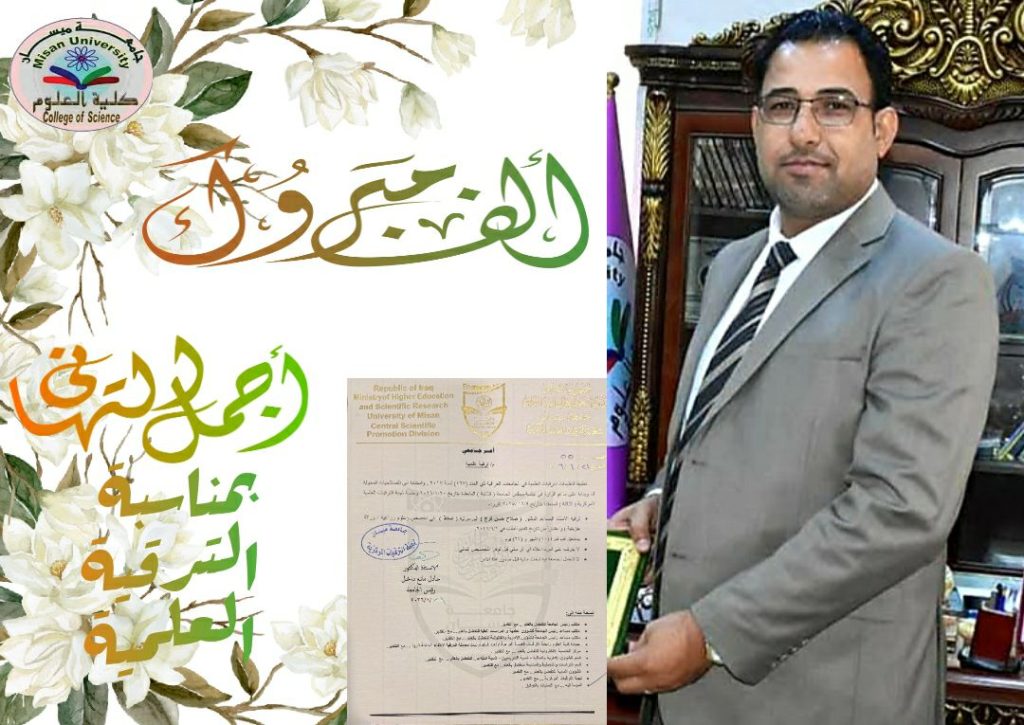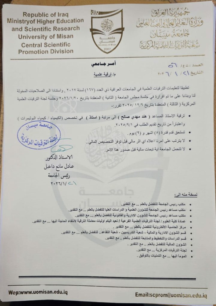 تتقدم عمادة كلية العلوم بإسمها وبإسم جميع منتسبيها أساتذة وموظفين بأزكى التهاني وأطيب التبريكات للأستاذ المساعد (هند مهدي صالح ) بمناسبة حصولها على مرتبة الأستاذية وللأستاذ الدكتور صلاح حسن فرج بمناسبة حصوله على مرتبة الأستاذية وأيضاً إلى الدكتور محمد عبدالرحيم بمناسبة حصوله على الترقية العلمية إلى مرتبة أستاذ مساعد دكتور .